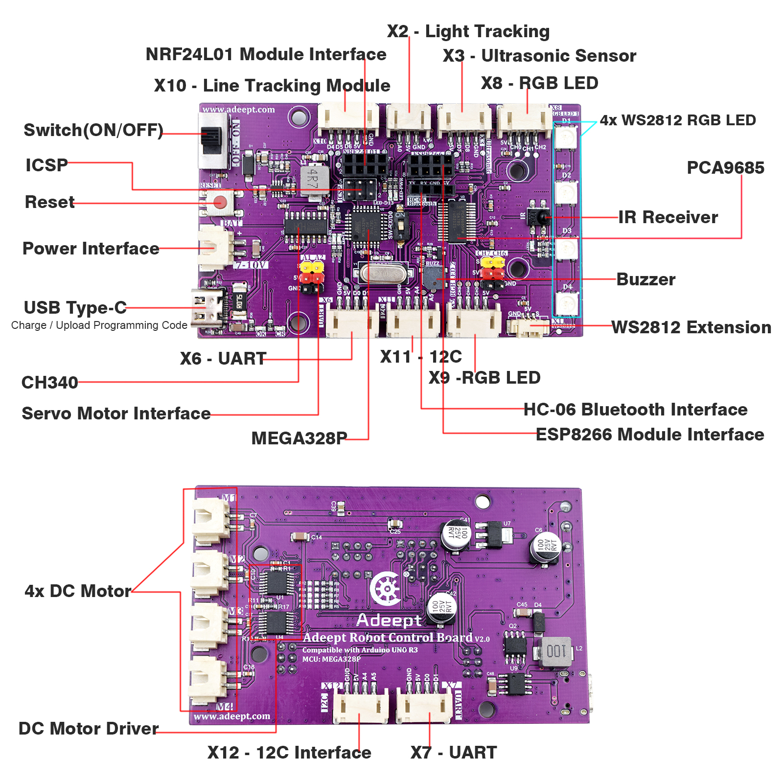 1x Adeept Robot Control Board(Based on MEGA328P, fully compatible with Arduino IDE)