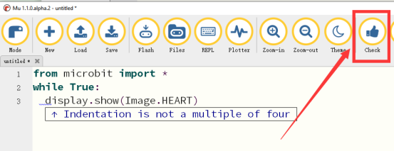 You can click the "Check" button on the upper right, and the Mu editor will prompt you where the code syntax is wrong. For example, the syntax error below is due to the fact that the line of code display.show(Image.HEART) does not have 4 spaces indentation. The solution is to delete the space before this line of code, and then use the "Tab" key to indent this line of code.